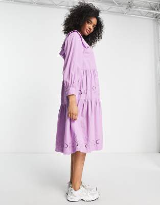 Selected Femme – Midikleid in Lila mit Lochstickerei und großem Kragen